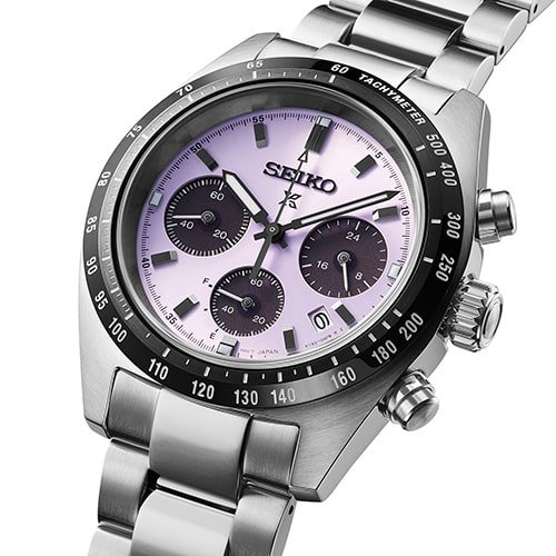 Powered by light, defined by color — a solar chronograph with a vibrant purple dial.